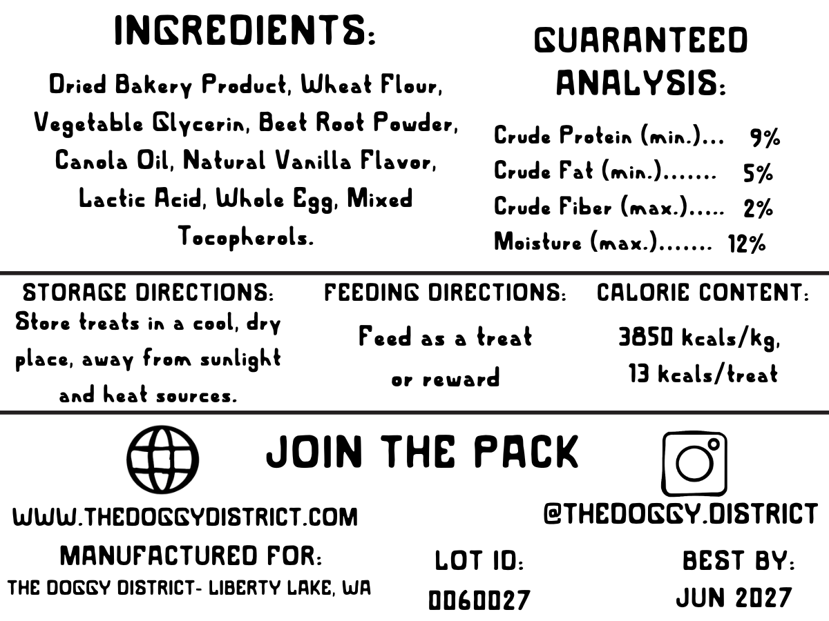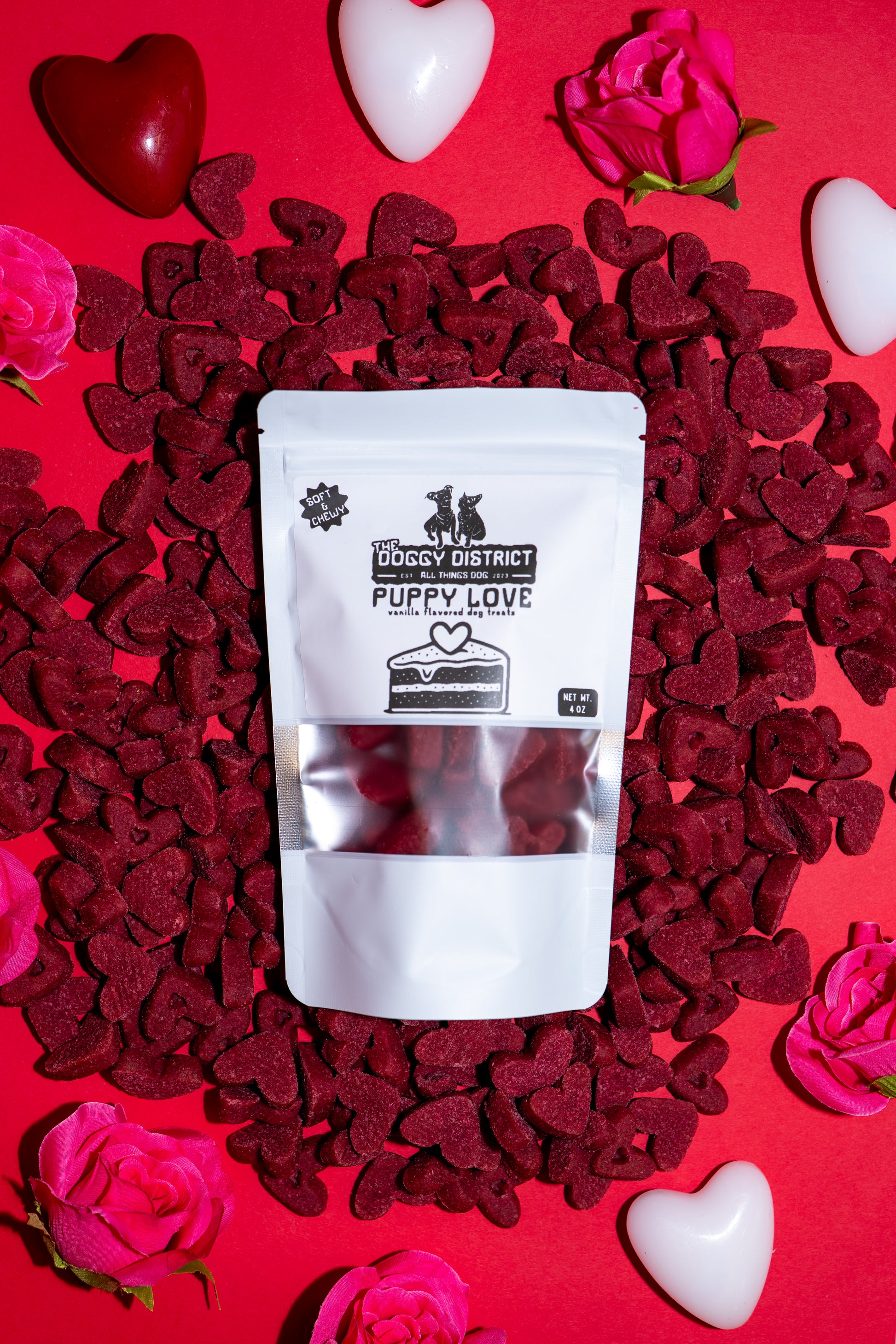 Show your dog some love with Puppy Love treats! These red heart-shaped, red velvet-inspired treats are infused with a delightful vanilla flavor your pup will adore. Soft, tasty, and perfect for any occasion, they make the ideal snack for your furry friend’s next treat break. Give your dog a little extra love with every bite!